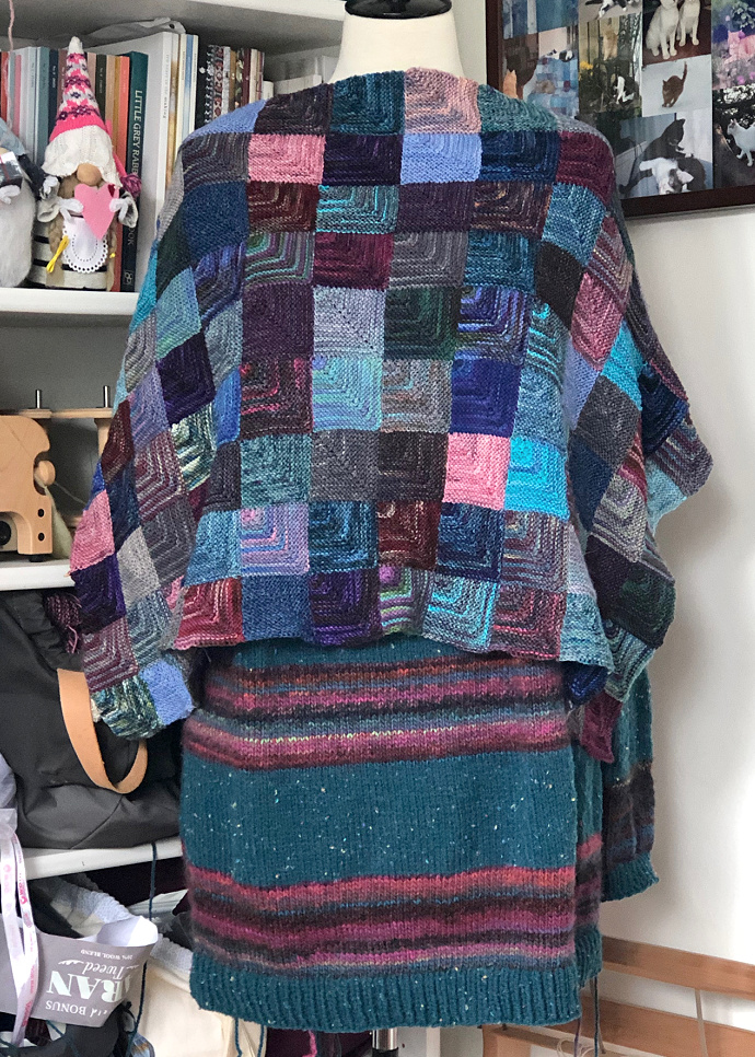 Progress on the “Memories Sweater” by Sally Melville continues. I love it. I love the colours and the mitred squares. You can see that the front is finished in the photo above and I’ve only a few more rows of mitred squares to do for the back.