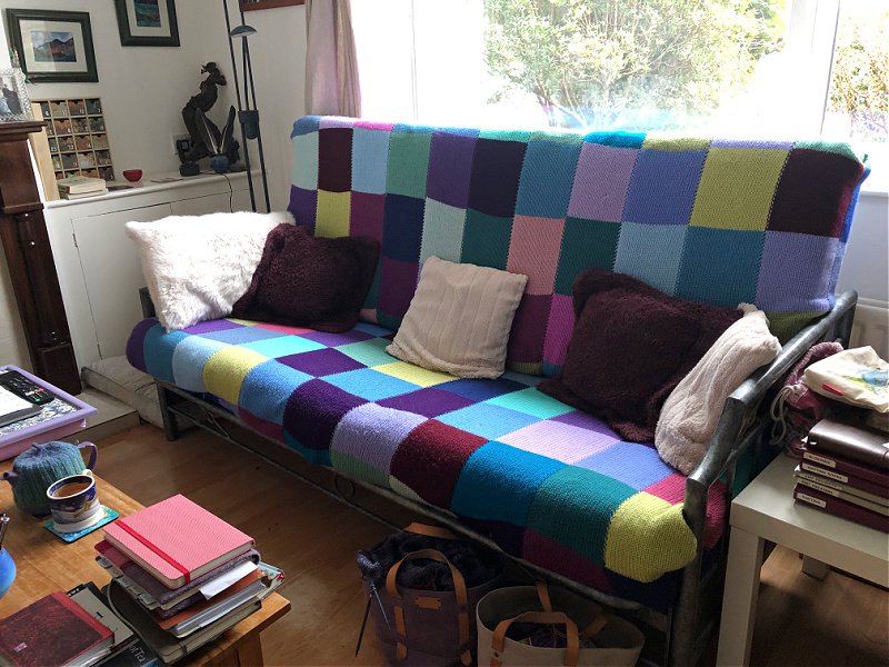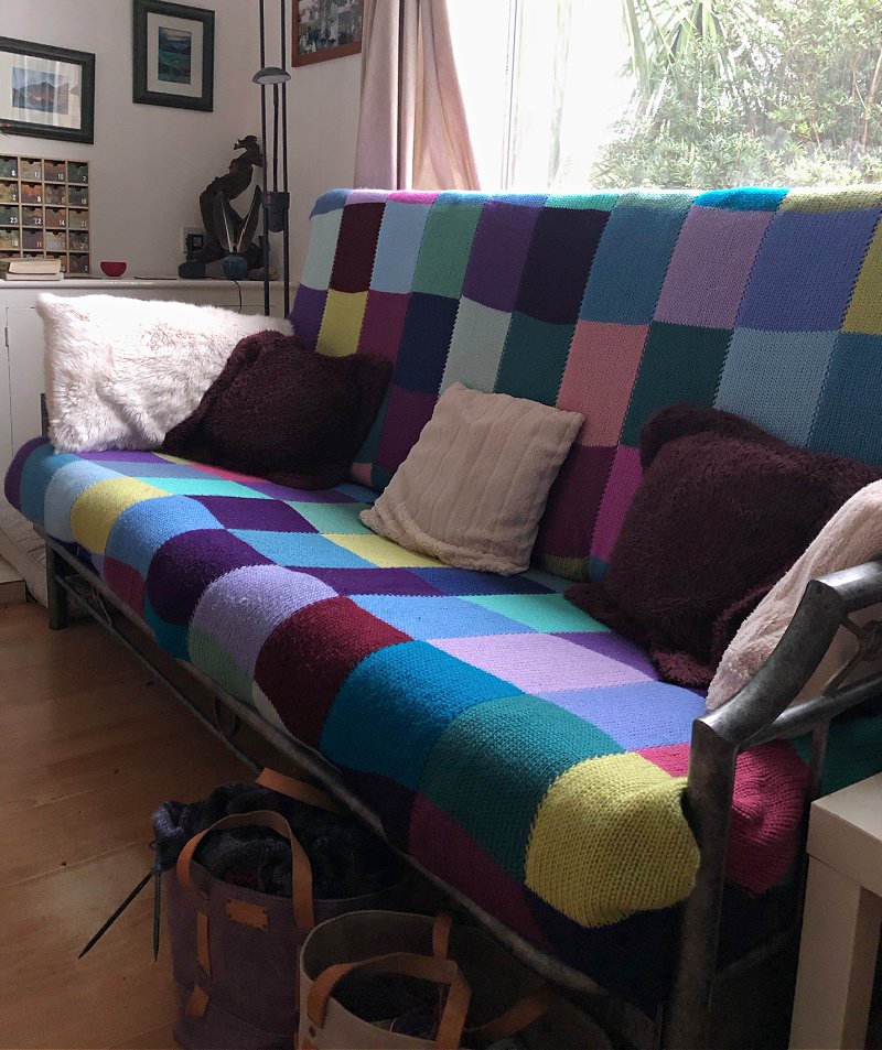 I used 25 colours of Stylecraft Special Aran to make the cover. I used 54 balls of yarn and only had a few small balls of yarn left over. Each square took approximately 24g to knit. The Stylecraft Special Aran comes in 100g balls and is machine washable at 30 deg. It can also be tumble dried in the low setting. This was important to me, as Bene (collie) likes to sleep on the sofa, and I wash the throws on it weekly.