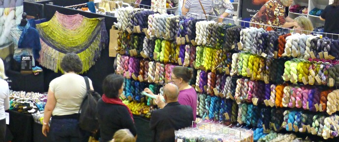 As with any festival (not that I have been to all that many), I like to have an idea of what I am looking for. I’m never after large quantities of the same yarn. I’m after special skeins that I fall in love with. I like to have a collection of single skeins and one of a kind skeins in beautiful colour combinations that really appeal to me and catch my eye. In the main, I like to knit shawls, socks, fingerless mitts and hats which don’t require large quantities of one colour… Although, in the last year I have been caught by the sweater knitting bug. Now that it has become a little warmer, my sweater project is hooked onto the handlebar of my exercise bike, and obsessive sock knitting has returned.